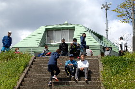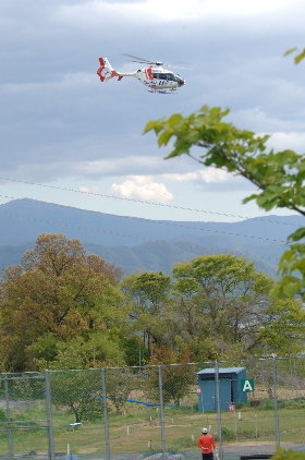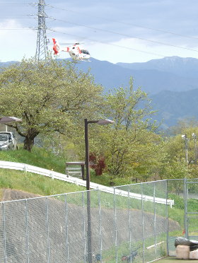 午後2時過ぎ、ぱたぱたと音がして長野県ドクターヘリが駐車場に着陸しました。隣りのグランドで練習のシニアリーグの子供たちもびっくり!このユーロコプターは巡航速度245kmでどこへ搬送したのでしょう。